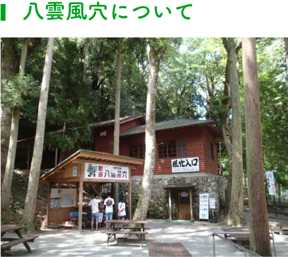 約500年前に開山したお寺「福泉坊」隣に「八雲風穴」はあります。当時より「清涼山」と呼ばれ、冷たい風が吹く地域であると伝えられています。真夏でも5~10度前後の冷風が出ており、天然のクーラーとして、毎年多くの人々が訪れます。また、年間を通じて気温の変化が少ないことから、昔から天然の冷蔵庫として利用されてきました。